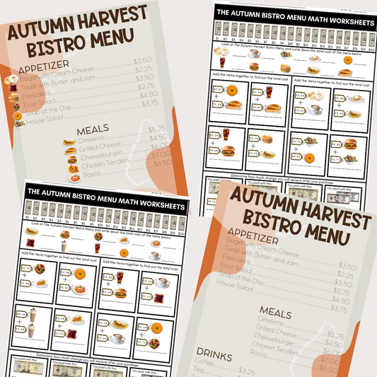 Autumn Money Addition Food Menu Math Special Education Worksheets NO PREP