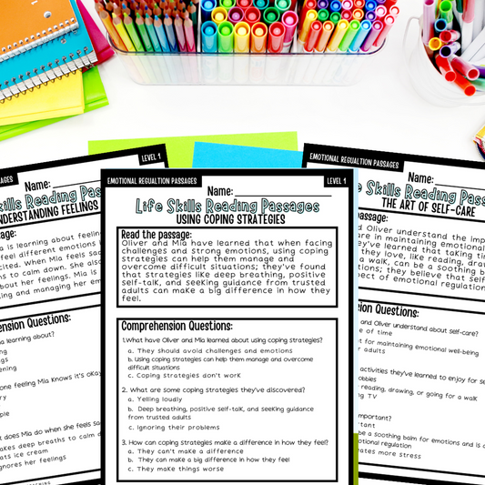 Emotional Regulation Life Skills Reading Passages with Comprehension NO PREP SEL