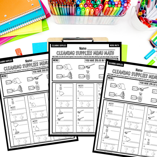 Interactive Cleaning Supplies Money Addition Worksheets - Hands-On Math Practice